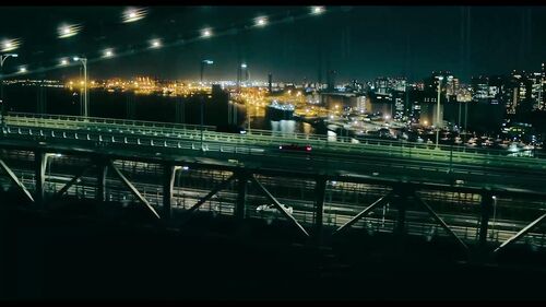 回到本片,伴随着samantha sidley的歌声(曲:ONLY YOU CAN BREAK MY HEART)两位主角开着红色宝马从东京的彩虹大桥飞驰而过,导演在开篇使用了大量的东京夜景,辽阔寂寞的夜空下淡蓝色的灯光雾气,莫名有种赛博朋克的超现实冷酷感