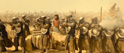 结尾40分钟的战争场面,更是严格遵循了客观、现实的理念,既没有《帕德玛瓦蒂王后》里“走台步式”的炫耀布阵、《一号自由勇士》中地道里蹦出骑兵的奇观,也没有《巴霍巴利王》中椰子树弹射突围、《凯萨里》中一人单挑百人的开挂式个人特写,而是非常朴实地从正规的阵型变化、炮火试探、步兵冲阵依序展开,直至近身厮杀的肉搏戏,也都是接地气的大力挥砍,几乎没什么花活,期间甚至还刻画了逃兵的现象。