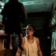 朱婆婆向她的木头车走去,拿出一只鞋,白鞋上有已干变褐的血迹。她把它递给少女: