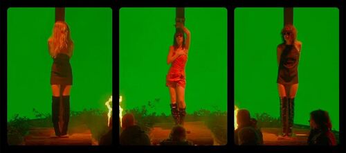 加斯帕首次采用分屏和变形画幅的手段,要么同时展现两个不同场景,要么展示同一个场景里不同角度的拍摄,两台摄影机的拍摄使这个局限片场内的叙事空间变得复杂,同时也捕捉到拍摄时台前幕后混乱不堪的状况。在高潮的一幕,更采用“三联画”的镜头设计,呈现出女演员与男演员、摄影师并置的构图,彻底暴露出女性处于男性凝视中心的本质。而这种富于宗教意味的画面构图也呼应着宗教故事里耶稣受难的经历,透过讽刺宗教的口吻再次强调女演员遭受剥削这个主题。