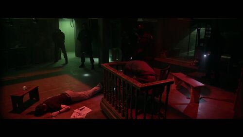而影片的结尾,警察找到了囚禁者囚禁被告的地方,冲进屋子的时候开枪了,最终,他们发现老人拿着枪,而囚禁者和老人都被击中毙命。