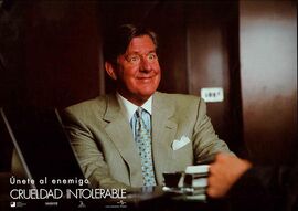 好莱坞经典老片的中配角,甚至寥寥几个镜头的龙套往往都极具特色。而这一优良传统在严重依仗巨星和电脑特效的现代好莱坞大片中已消失殆尽。只有很少一些导演还在执着坚持。其中就有科恩兄弟。本片中,克鲁尼的助手十足有趣(《逃狱》中的最后反戈的特工)。此人虽在离婚官司中摸爬滚打多年却近于天真的多愁善感:经常被虚伪的海誓山盟感动的声泪俱下。而克鲁尼的老板则是个插着氧气管还在指手画脚发号施令的老顽固。而带着怀揣喷雾剂的愚蠢的哮喘杀手、游泳池畔闲扯聊事非的琼斯的富婆们、法庭上作证的同性恋做派十足的抱着小狗的男爵、甚至那个只有一句台词的一脸横肉的法庭女速记,都比较生动鲜活。
