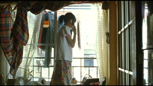 在此以影片开场几场戏为例简单讨论侯孝贤所使用的调度技巧。这其中包括了第二场戏,阳子在家中一边晒衣服,一边通电话。其后,阳子到书店见好友肇,书店的场景先后有两次,但取景角度有180度变化。这几场戏普遍使用了段落化的镜头,也就是一镜到底。这是时空完整性表达的传统,巴赞式的美学。这场戏虽然没有任何戏剧性的事件,但却充满了丰富变化延展的动态过程。首先阳子有一个目的性很强的动作,晾衣服。目的性保证了动作的自然舒展。接着电话响起,她要边接电话,边晾衣服。注意力更为集中,更不会有表演的趋向。但侯孝贤还不满足,为阳子还增添了一个动作,对邻居来访的接待。而此过程是用画外空间来表达(阳子在这过程中有走动,但摄影机并未殷勤的跟随游走,而是随意的游动),邻居并未出镜。连续性动作与思维(通电话)的配合,保证了演员自然流露的状态。但这依然不是全部,这场戏中还存在着一个至关重要但很容易被忽略的技巧。这便是地上的电风扇。这台电风扇是摇动式状态,处于前景。虽然占据画面空间并不大,但它的存在实质性地改变了画面的状态。再有便是背景中偶然飘拂的窗帘与衣服。这一道具的功能与电风扇同一,但更有自然形迹的意味,更有动态的效果。不过,千万不要以为这衣服真的是被风吹起,这其实是侯孝贤的惯用技巧。很多他影片的幕后花絮都如实供出,飘拂的帘布是鼓风机吹动的结果。动态的、连续的、画外的、多义的空间调度技巧便是这场戏充满生活况味的根本原因。