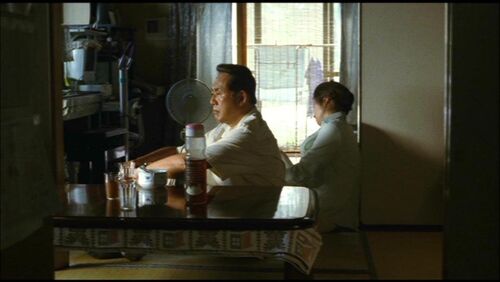 与这场戏结构上对称的,是父母来阳子家中探望。老牌演员小林稔侍扮演的父亲,几度欲言又止,从画面的前景踱步到背景,又腾挪回来,身体显得很疲惫。父亲最后仅仅说了句“喜欢吃吧”。实际上侯孝贤为小林稔侍准备了大量台词,但小林实演进入情境后觉得以身体表达的欲言又止状态更为自然。而在这之前,母亲对父亲说过一句台词,“你太狡猾,重要的事还是要说的。”就这一句话,精要地提炼出了这一家庭关系的全部要义。