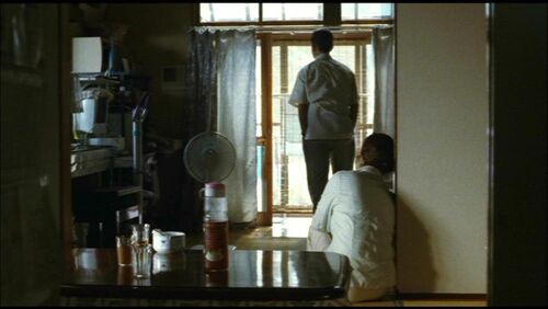 父亲这一个镜头中由画面前景走到了画面背景深处,父母的脸由半面对观众变成了背对观众。第二幅图中,电扇、父亲、水杯构成了一条直线,画面空间被割裂成两个部分,意味着家庭结构的涣散与不稳。特别注意的是,这一次电扇没有左右摇动,是静态的。