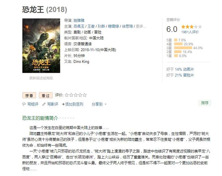 目前国内也开始关注到这一题材,最早国内出现的恐龙动画片:《恐龙王》在豆瓣评分是6分,良莠不一的评价。