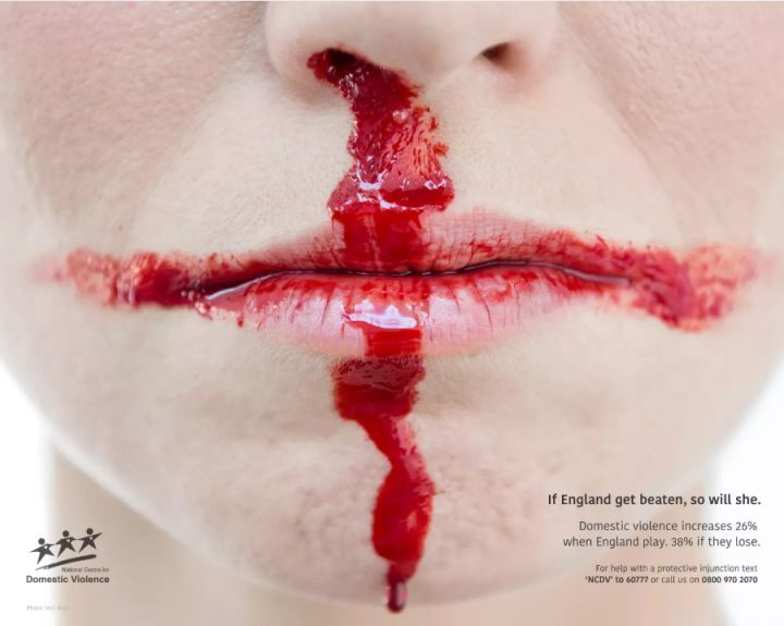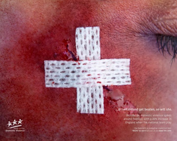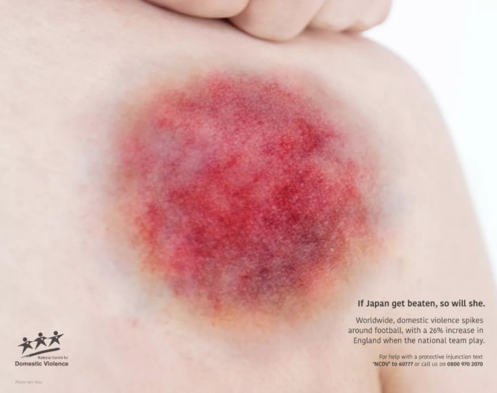 据调查,家庭暴力事件在英格兰进行足球比赛时发生率增加了26%,而在英格兰输球后,发生率增加了38%。Wunderman Thompson为了将足球运动和家庭暴力联系在一起,用血迹来组成国旗的元素。这次活动共制作了3张海报,分别是英格兰、瑞士和日本,并在世界杯期间,持续展出到世界杯结束