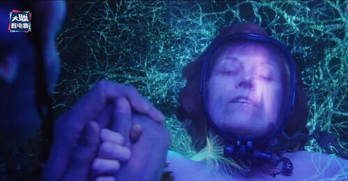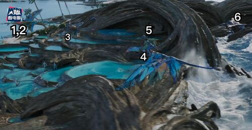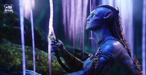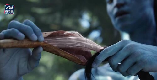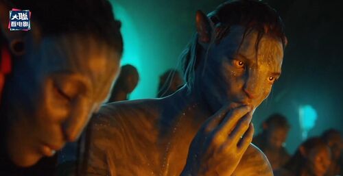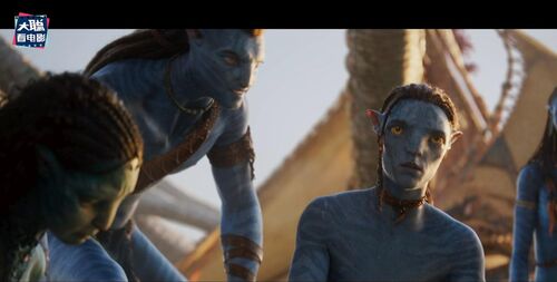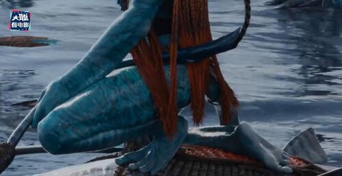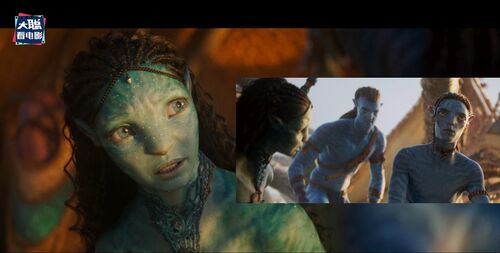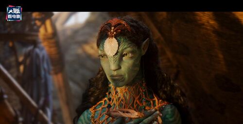 再下一个画面是更年轻的一位珊瑚部落的纳威人,额头上有小珍珠装饰,这个画面和凯特画面并不衔接,反而是衔接有杰克儿子那个画面,因为她看得方向,右边虚焦处是蓝皮肤的纳威人,应该是杰克儿子。