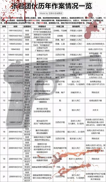 下方为我根据具体卷宗整理出来的张君团伙历年杀人抢劫的具体情况一览表。