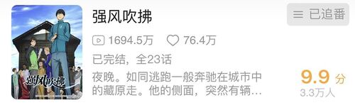 2018年十月,《强风吹拂》动画版播出。这个季度是日本动漫十月番阶段正式开始的时候,在这里推一下,此动漫在B站达到9.9的评分,豆瓣评分9.6。是非常优秀的动画。