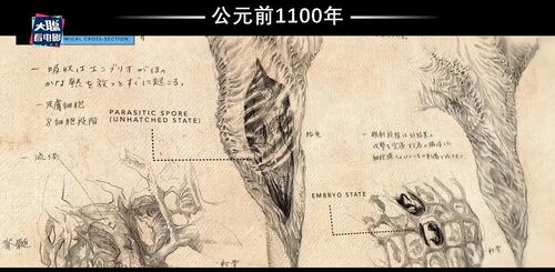 影片开始前面也已经交代了,他们在菲律宾发现了哥斯拉同类达贡的化石遗骸,同时还有两颗孢子。