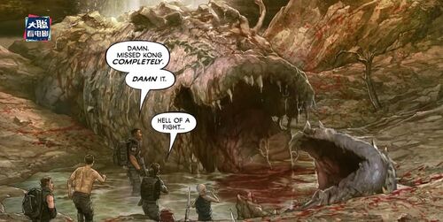 探险队为了逃离这里,他们把现有的装备改装成电动船艇和通讯工具,尝试和外面联络,在他们寻找失踪队员时,中途遭遇了怪兽攻击,比尔·兰达被做了骷髅爬虫的便当领了便当。