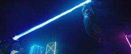哥斯拉金牌招式原子吐息伺候,但怎料多年不练手打偏,而基多拉居然也能喷,只见三只龙头射出金色重力射线,直接命中的哥斯拉受伤倒地,人类战斗机群这时赶来,基多拉不想多纠缠振翅飞走。