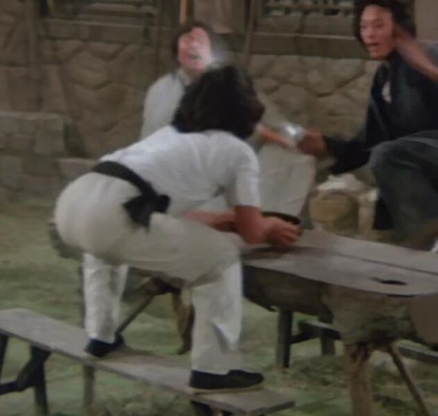 元文成年后,第一次在邵氏拍戏,便是在本片中演主角。说他起点会不会太高,可有这么多大咖师兄弟来背书,也能说得通。看他在片中的表现,可见他是有真功夫的。那跟头说翻就翻,他也能倒立,可能不及成龙那么撑得时间长,也能给对手来一脚。元文的下盘功夫很扎实,弹跳性特别好。挨于占元的打,没白挨!