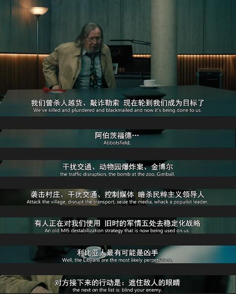 完整地呈现了这次连环袭击的动机。复仇是外壳,也是对于执行者(杀手们)的诱饵,核心动机来自于利比亚当地某财团,而他们最终寻求的是经济利益。他们提供的账户关联Peter Judd担任董事的一家离岸信托公司,而Judd并不知情,Diana因此推测这家财团一边试图和前内政大臣(Judd)进行利益交换,一边针对安全局执行这起复仇和勒索行动,为的是同样的目的,羞辱和补偿。可是