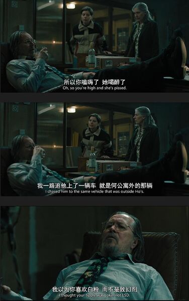 这里的灵感触发机制很像是第一季里他溜号去ICU看Sid时的经历?当时斯劳屋也面临着被甩锅的危机,他去医院完全是出于情感,Sid对他很友善,他很愧疚。正是这段看起来毫无必要的拜访,让他有机会回忆与Sid的对话,从而想起自己当时在讲跟踪Diana的事情,而刚才在绑架屋里看见的死去的卧底就是当时和Diana见面的人。就这样,他想到了帮助斯劳屋摆脱麻烦的办法——拿到照片,和Diana对质。