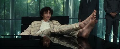 白衣员工解释道:"天才公司是十年前由一个叫卡瓦利尔的孩子创立。"此时特写镜头猛然切到卡瓦利尔,他正把脚高高翘在桌上,脚底可见几处黑痕,与锃亮的会议桌形成鲜明对比。