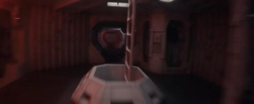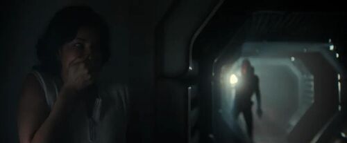 当视角转回马奇诺号,摄影机以异形视角滑过船舱通道,让我们看到异形眼中的世界,这种运镜方式直接致敬《异形3》。