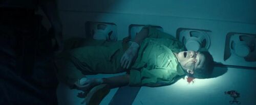 手术台上的船员胸口的血迹暗示他已被破胸者开膛破肚。