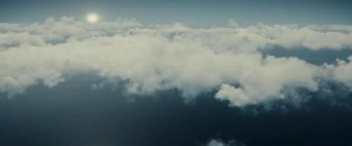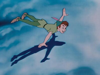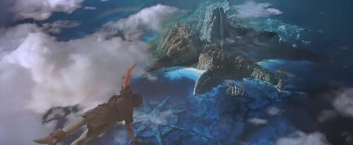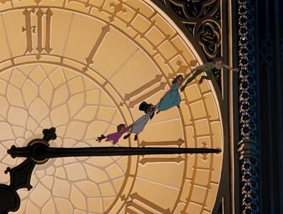镜头穿越云层,飞向梦幻岛,致敬1904舞台剧和1911年小说《彼得·潘》中飞越云层抵达梦幻岛的经典场景,包括《铁钩船长》、迪士尼动画《小飞侠》在内的诸多改编版本都再现过这一场景。