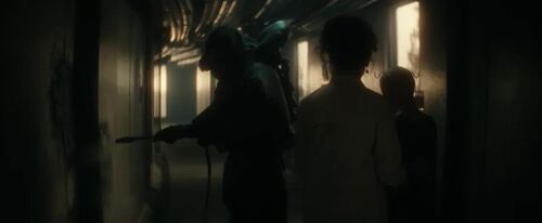 温蒂去做手术的途中,她路过一个正在喷洒破损门体的防护服人员,门后传来野兽的低吼。