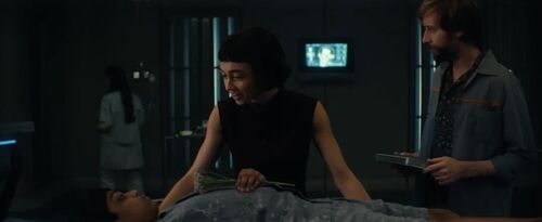 Texas Switch技法再现:伪一镜到底拍摄意识转移手术,每次镜头移回手术床,患者与手中的花都已悄然替换。