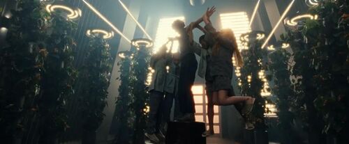 实现这个魔术般的效果并不需要使用特效,这是一种名为"Texas Switch"的转场手法:演员跑离镜头后立即蹲藏,摄影师旋转机位拍摄早已就位的替身,而真正的温蒂其实在这个镜头的下面。