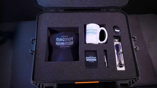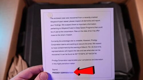 箱子上有维兰德-汤谷公司标志,里面有"马奇诺号"帽子等周边,还有一个内含5段录像的U盘,精心包装成天才公司从飞船计算机提取的机密档案。