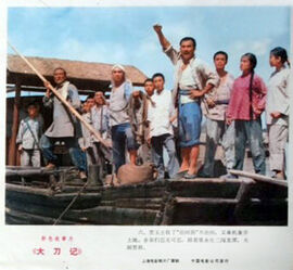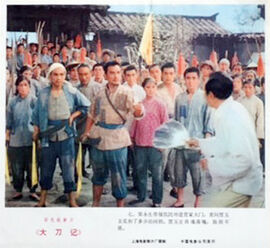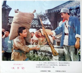 这部电影也算得上群英荟萃,男一号杨在葆自不必说,两大老戏骨仲星火和陈述,还有小字辈的郭凯敏和张芝华,这两位后来在八十年代经常是主演。演恶霸的李炜更是四十年代名片小城之春的主演。 电影讲述的是抗日战争前期,国共合作那一段,故事有点散,不仅讲了两代人的故事,而且还有杨在葆三次大闹地主家,中间还去了趟延安,大刀在故事中的作用不大,主要还是个穿线。 插曲运河儿女心向党,天上北斗亮晶晶 演唱者吴萍 天上的北斗亮晶晶 地下的运河水清清 自从来了共产党 梦里也要笑几声 千里平原春风暖 万年枯树发了青 运河儿女心向党 毛主席是咱大救星!