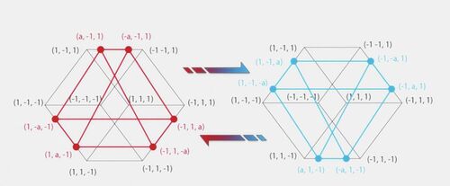 这张图黑线部分其实是一个正方体,并且以正方体中心建立了坐标系。可以看到,红线和蓝线围起来的图形与女主给出的解释是一致的。红线与蓝线的如何进行相互转换,再推及到红尘形态转换,个人理解正是需要苇原论文提到的“正交对角转换器”,在印度的BB也是在女主的启发下开始尝试制造“正交对角转换器”,从而制造出了副产物毒药“哈拉哈拉”。虽然BB说自己失败了,但确实让红尘发生了形变,所以这里的失败应该是指形变后的红尘无法维持住形态。线性代数里一个向量乘以正交矩阵,在空间上可以表现为旋转和镜像对称,或者说是改变了坐标系(红线和蓝线也可以通过旋转和镜像翻转相互转换)。正交对角化则是利用正交将原有矩阵分解成由一系列的特征向量和相对应的特征值。如果可以对红尘进行正交对角化,求得它的特征向量和特征值,那么对它进行变换的方法过程就基本明了了,是不是也了解了红尘的构成,可以做到红尘从第一阶段到第十三阶段的转换。