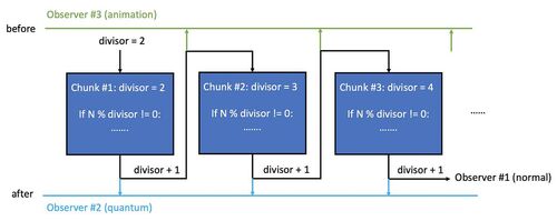 正常情况下代码是按照黑线,也就是一个一个代码块按顺序执行。如果有一个人站在蓝线上,那么对他来说所有的代码块都是同时发生的,只需要执行一个代码块的时间就可以知晓所有代码块的计算结果(这也是量子计算中shor算法的基本原理)。而男主在这基础上更近了一步,追求的不是同时执行,而是在知晓第一次代码块计算结果的时候回溯时间,带着未来获得的知识(N是否可以被当前值的divisor整除)再次执行程序,而站在观测者的角度(也就是站在图里的绿线上),代码块还没有开始执行的时候就已经知道了divisor的值。这个想法本质上和冈部伦太郎为了救真由理无数次回溯时间差不多,即使伦太郎试了上万次,对于助手这个观测者来说拯救真由理(运行程序)这件事也是从来没有发生过的,只知道真由理活了下来。