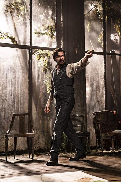这一版的《万尼亚舅舅》的结构很特殊,虽然没有脱离舞台,仍然在刻意的强调舞台的存在。先是描述了新冠疫情下的剧团停演,舞台上的道具都罩上了一层白布。然后是解封后演员们回到剧场,演出开始。老奶奶将那些白布一层层的揭开,医生上场开始台词。编导这样安排是有自己的考虑的。通常我们看电影,从小孩开始,就不住的问大人:“这是好人还是坏人?”得到回答后,不由自主的就站到好人一边,一起和坏人斗争,直到胜利。其实普通的观众们看电影也是这样,往往下意识的将自己代入到影片中的某个角色中,伴他喜悦伴他流泪。而在这里,编导有意制造一种距离感,让观众明白,我们是在看戏,是从戏中去体会契科夫所说“既没有一个天使,也没有一个魔鬼”的场景。不需要观众的代入,我们和角色是疏离的,我们是在另一个世界中去观察这一个世界上所发生的事情。因为故事本身就是这个世界上真实的生活。编导并不指望我们去判断人物的好与坏,只是去冷静的剥开人物的灵魂。这种置身事外的观察,或许能让我们更深刻的体会整个故事背后的精神。