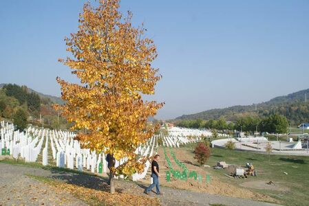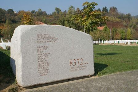 作为屠杀纪念地的波托察里公墓,距离市中心6公里,与我同时抵达的来访者,除了一群到塞尔维亚进行交换学习国际政治专业的美国学生,就只有一辆挂着瑞士牌照的SUV,车里走出一家老小,女的缠着头巾,估摸是撑过劫难后移民国外的幸存者,和那些在瑞典、美国都能见到的波黑穆族难民家庭有着相似的悲剧故事。入口处的大石碑上,雕刻着“8372……”几个大号红字,省略号说明着,8372只是“已知的、能对照出名字的”遇难人数,还有相当数量骸骨的DNA在等待校验,其中的不少估计将永远查无此人。另一块白色方碑的正反面,以波斯尼亚语和英语写着墓志铭,“我们向全能之神祈祷,望怨气换为希望,望复仇变为公正,愿母亲的眼泪变为祷告者,暴行从此远离斯雷布雷尼察和它的人民。”