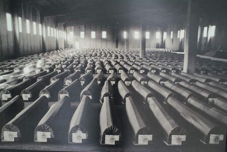接着,他将我们带到墓园对面的厂房车间。大屠杀开始前,这里曾是400名荷兰籍官兵的营地,是执行联合国维和部队安全区的保障所在。如今车间里留下的,是光秃秃的墙壁,以及一些遇害者的遗物和生平简介。面前一扇玻璃窗里,陈设着一纸早看不清字迹的祷告词,相伴的生平故事关于1977年10月出生的Dzevad:战火日益迫近,家人依偎一起。斯雷布雷尼察成为联合国安全区后,生活容易了一些,Dzevad每天穿着一双几乎见底的破鞋去上学,成绩却还一直排第一。1995年7月11日,被带往森林的他,与妈妈告别:”是分开的时候了吗?真希望小时候你就离我而去,那样或许会少几年痛苦。”妈妈和姐姐一直盼望着17岁的他,有一天能回家,直至2004年1月被验出了DNA。