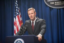 于是男猪就被调到闲职去啦,老婆也有怨言啦,同事不经意还冷嘲热讽啦。总之这段很狗血,也没交代突然掉下来的那是啥玩意。但好在过渡比较快。一下子棒子总统就来访了(好像说的是minister),一行人风风火火的进白宫啦,总统会见啦,唧唧呱呱客套起来,棒子总统一脸刚被曝菊的表情。