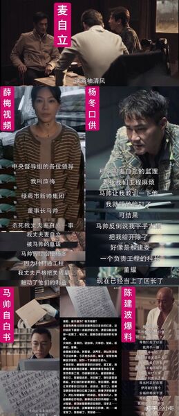 1.何勇(麦自立线):薛梅尸体→陈建波爆料→马帅/董耀/高明远;马帅林汉死因→宋涛造假→张桐生投毒→裴伟内鬼→贺芸/高明远;2.李成阳(马帅线):卧底新帅调查→大嫂爆料→董耀;3.林浩(孙兴线):徐小英裸贷→胡所→孙兴→贺芸/高明远五、正反派分析1、正派督导组:骆山河(督导组长) 索东(后勤保障) 赵立根铁三角:何勇(专案组长) 林浩(市局刑警) 李成阳(法律顾问)肖佳(中江省委书记) 黄鹏达(绿藤市委书记) 谢中林(市长):打酱油角色,都是一二把手,为了政治正确。2、反派王政(大BOSS) 贺芸:充当保护伞;被判刑。武双岭(副市长) 曹鹏(伊河新村支书):参与伊河新村项目;被判刑。高明远 董耀 马帅 陈建波:高号称绿藤市"地下组织部长/现金王",性贿赂王政,都参与了14年前麦自立案,董耀杀麦,马帅目睹并留下自白信,高明远背后指使,陈建波负责埋尸。高赫-孙兴:非法经营黄赌毒,14年前和10年前分别强J杀了麦自立表妹、李红;被判死刑。老宁:杀了4人(林汉-薛梅-徐小山-大江),与大江同归于尽。宋涛:伪造尸检报告,替换毒检样本;被抓。裴伟:配合贺芸并给高明远通风报信;被洗白。胡笑伟(派出所长) 小方(民警):胡所诱供徐小山,逼徐英子撤诉,间接害死徐家姐弟;根据胡所手势,小方向徐英子要5万。3、受害者麦自立一家:麦自立因举报被灭口埋尸,薛梅因上访被灭口埋尸,麦佳因堕落被仇人包养,充当性贿赂工具,麦表妹被高赫强j杀害。一家子太惨了!徐家姐弟:弟弟被灭口,姐姐跳楼自杀。