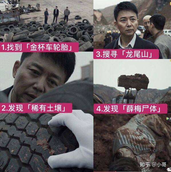 6、薛梅的尸体是这样被发现的~→在监控中发现薛梅最后出现在「林子口」 ;→林子通往两个方向,其中一边是机场高速,在林子周边挨个排查,从农户口中得知,薛梅去的「机场高速」;→调机场高速监控,逐个排查疑点,发现一辆可疑的「洒水车」;→追踪洒水车到废仓库,找到扔下的洒水车,查到薛梅血迹但无人,怀疑被转移,在废仓库发现「金杯车轮胎痕迹」;→全市排查,在报废车场找到已拆解的金杯车,找到「金杯车轮胎」,发现山上某种稀有土壤;→上「龙尾山」搜寻,何勇观察所有车辆,发现一辆铲车装有一勺土停在半空,觉得可疑,于是派人倒土,发现薛梅的尸体。