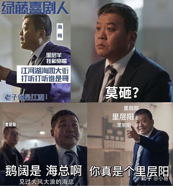 17、全剧搞笑担当——海哥海锅语录:你给老子玩浆糊(江湖),老子就是浆糊么斯啊,兜岛举,兜岛是啥子鬼啊,鹅是见过大风大浪的海总,鹅会怕兜岛举?哩层羊,鹅决定把公司交给你掌管,鹅毛得时间拉。里层羊里层羊,你心箍眼蛮多咧,你真是个里层羊。