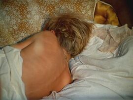 普拉东诺夫忽然说起了与当时的气氛不协调的事情,说起了他与索菲娅的故事。他一边说一边捕捉索菲娅的目光,在向她问询,她也在注视他的目光。他观察到了她对他所说的话的反应。将军夫人也倾听着普拉东诺夫所说的故事,她看看他们两个人,很嫉妒索菲娅,这时音乐的主题在简短的一刹那进入了影片,这音乐是病态的,令人惶恐,只有几个节拍就消失了,灯芯微微地在发光……