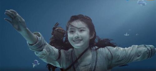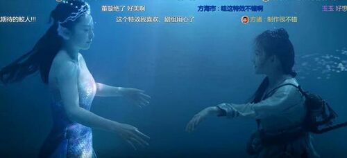 董璇扮演的鲛人琅嬛,没有像《十二谭》里那样套个胶皮衣就出镜。细密的鱼鳞泛着彩光,修长的鱼尾游动时十分飘逸,但浮在水里的时候姿势看得很别扭。