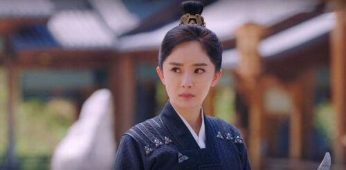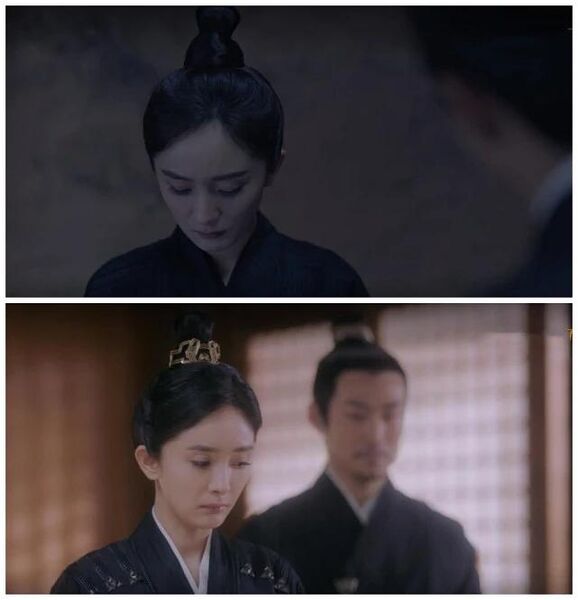 杨幂的造型似乎是将自己的真发和发套结合,所以前额和鬓角看着挺自然。为了贴合“小公子”的身份,眉毛也适当加粗,增加了英气感。