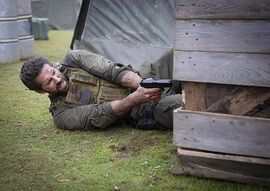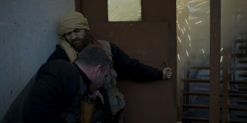 而为了合理化海豹突击队员以一敌十的能力——除了后来主角单枪匹马潜行玩个人solo的段落不提(这段场景中的近身格斗设计得非常精彩),其实镜头中已经给了很多扎实的细节来展示小分队的团队战术素养。