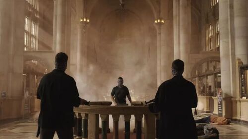果然,这时传来纽约国际银行遭到抢劫的消息。可令人惊奇的是,这群劫匪并不想要钱,而是冲着监控镜头挥动着一张纸,上面写着一句“向女王鞠躬”。
