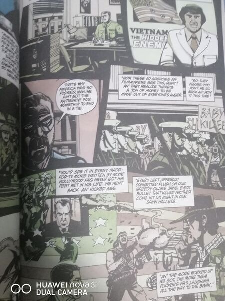 漫画版的各种悬疑,惊悚,极度血腥暴力,以及为什么要反战,战争给人带来的问题什么都没有了,没有人是愿意呆在这么个鬼地方的,连所谓的联合国维和部队都不干干净事,虐待犯人这群人都干的出来,美国政府的贪婪黑暗,为了达成目的不择手段,以及美国真正的敌人就是美国人自己,不是来自外部的,作者真正担心的是美国人自己(种族主义者,枪支问题,没有人权,不能说真话只能说假话,虚伪的军官,杀人成性的疯子,动不动就自己身上绑好炸药在入群地区爆炸,以及战地记者靠拍照来获取自己的成功,别人的命不是命)这些东西全都没有了,是不是说自己不好的政治正确的就不拍了。