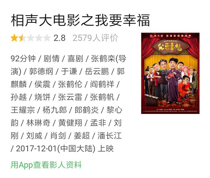 更讽刺的是相声大电影的导演张鹤栾辉煌的影视生涯中唯一拍过的电影就是这部了。说实话一看这名我以为是老郭鹤字科的徒弟,也许真的是他徒弟拿来凑数的……