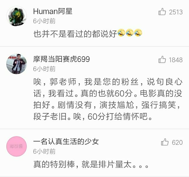 嗯,我是不知道该怎么说了,还能怎么说,翻了一眼评论,突然觉得这世界上除了纲丝更多的还是明眼人,然而那又能怎么样,郭老师反正也不会听,毕竟一看就是没看过电影的!