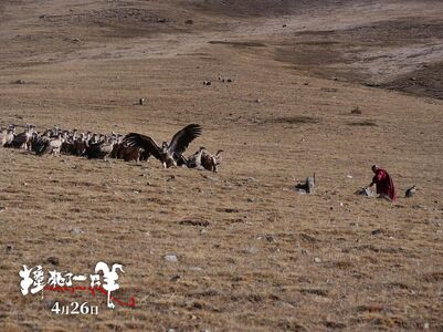 那天我们早早就去了,美术部门把买好的牛肉带到了现场,准备给秃鹫吃。我们架好机器等待,不知道秃鹫什么时候来。天葬师说,也许今天秃鹫不会来了。