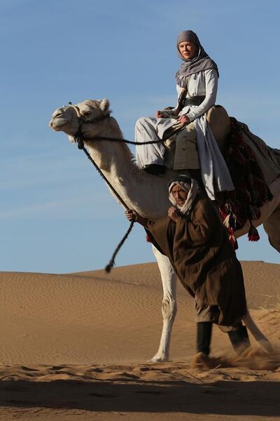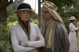 其次,是人物。可以说历史上的Gertrude是一个非常鲜活、饱满的女性形象,她的丰富学识、远见和胆量都是当时及之后的女辈翘楚,无论是大英帝国中东政策的制定上还是阿拉伯政治与部族关系的纵横捭阖中都能看到她的身影。这样一位女性的形象,在影片中却变得非常扁平化,所有的智慧、远见、坚韧、野心与外交技巧等都消散在与两位男主的爱情纠葛和美轮美奂的大漠风光之中。即便是日记旁白也以沙漠之美和爱情之折磨为主题,完全没有充分表现以Gertrude视角所看到的贝都因人政治、社会、文化及在此影响下她本人世界观的形成与变化。如果说妮可饰演的Gertrude是一位沙漠中的无冕女皇,那也只是一位因有美丽外表而在漫漫黄沙中脱颖而出的一抹亮色,仅此而已。