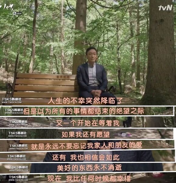阿兹海默会慢慢折磨他,吞噬他的记忆。他会突然忘记自己要去做什么,会因为记忆混淆跑去前妻的家,会把现在儿子的名字叫成逝去的东宇,甚至到最后,在家里找不到洗手间,会穿错鞋出门,会不认得自己的妻子儿子女儿……寻找东宇车祸事故的真相是朴泰硕xi的重要目标之一,可是他却担心自己没有时间去完成这个愿望,更担心就算自己找到真相了也会忘记真相。我想,不管多么强大的人,这些都是非常难以承受的一件事吧。<图片6>