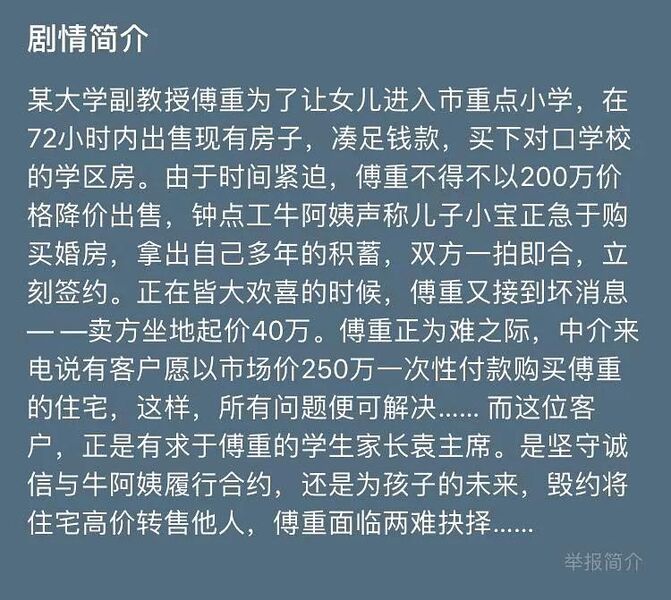 傅重是一名大学副教授,为了帮助女儿顺利进入市重点小学就读,他决定在72小时内出售现有住房并购买对口学校的学区房。时间紧迫之下,他以低于市场价200万元的价格将房子挂牌出售。钟点工牛阿姨得知后,声称儿子小宝急需婚房,并愿意拿出多年积蓄全款购买,双方当即签约。 然而,就在傅重以为事情顺利解决时,原房主突然坐地起价40万元。与此同时,中介来电称有客户愿以市场价250万元一次性买下傅重的住宅。这位神秘买家正是傅重学生家长袁主席,他有意通过高价购房来寻求傅重的帮助。 面对诚信与孩子未来教育之间的两难抉择,傅重陷入了艰难的思考:是坚守承诺履行与牛阿姨的合约,还是为了孩子的学业前程毁约转售房屋?最终,影片将展现他在价值观和道德困境中的挣扎与选择。